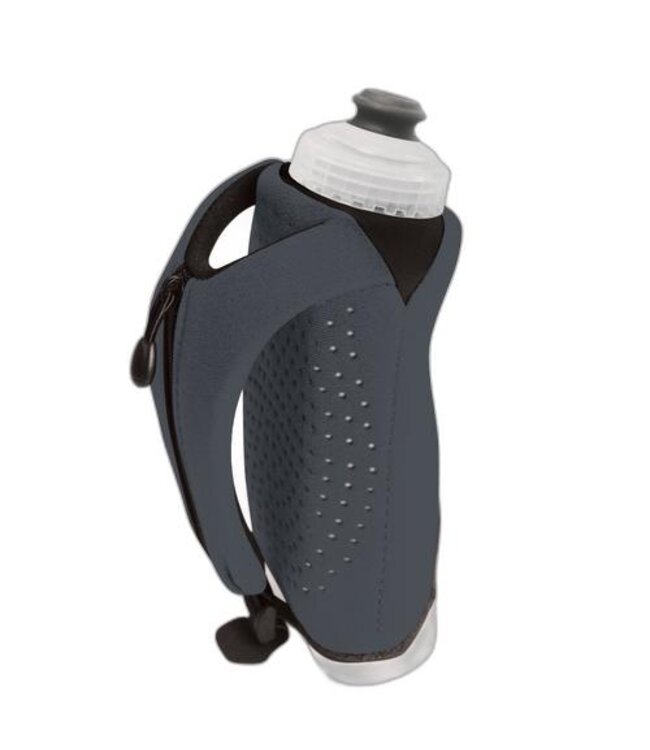 This handheld water bottle is equipped with an expandable pocket for essentials, including an internal key fob and ID/cash pocket. The adjustable strap ensures a custom fit, while easy access outer gel slots provide convenience on the go.