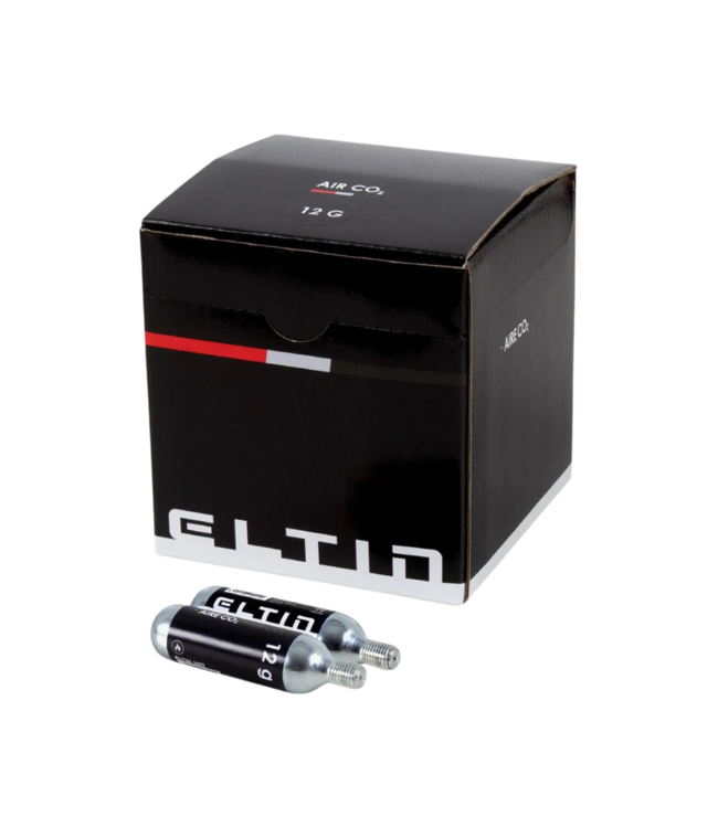 The Eltin CO2 12g cartridge provides 12 grams of pressurized CO2 in a recyclable aluminum shell with a 6 mm threaded neck, designed for rapid bicycle tire inflation with compatible CO2 inflators and suitable for various tire types.