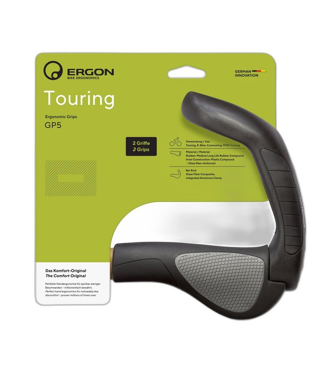 The Ergon GP5 Grips provide cyclists with exceptional comfort and control, featuring a composite-reinforced bar end for added ergonomics. These grips are designed to offer multiple hand positions, improving rider leverage and reducing fatigue on long rides. The GP5 grips are made with a German rubber compound, ensuring durability and UV stability.