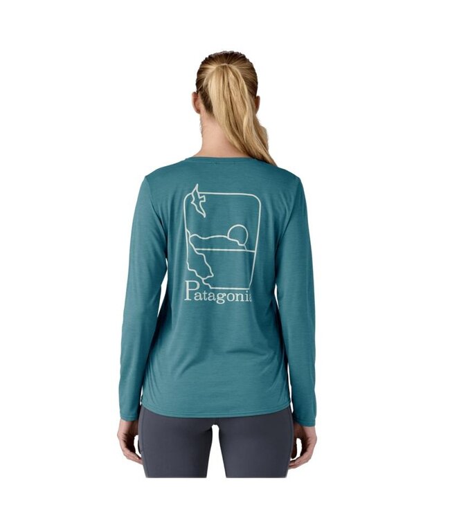 The Patagonia Women's Long Sleeve Capilene Cool Daily Graphic Shirt is designed for maximum comfort and versatility, perfect for both trail adventures and water activities. This lightweight shirt is crafted from 50-100% recycled polyester, offering a sustainable choice for eco-conscious consumers.